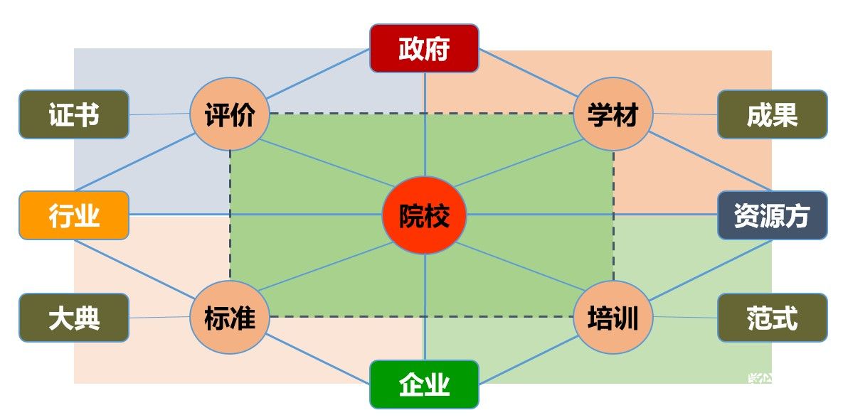 (2)組織執行層面:行業、企業、院校、資源方參與的標準、評價、培訓、學材等方面的貫通執行工作。
