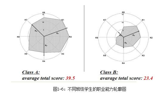 呈現給每位被試的測評結果:測試完成后,每位被試不但可以得到一個能力總分和自己所處的能力級別,而且還 可以得到一份描述其職業能力特點的輪廓圖(見圖 1-3)。輪廓圖不僅展示了三個能力級 別,而且還包含了八項能力指標,顯示了能力模型的多維特征。這可以使被試清楚地了 解自己的優點和缺陷,從而明確未來的努力方向。