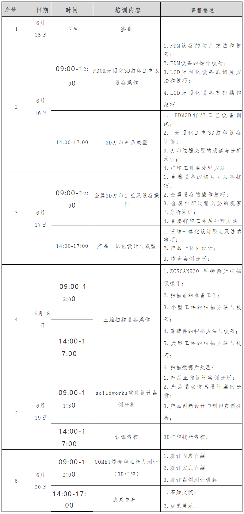 訓練營課程包括理論知識和前端技術講解、FDM、光固化和金屬工藝3D 打印機實際操作訓練、三維掃描建模和三維檢測、soildworks軟件設計案例分析,COMET國際職業能力訓練等。