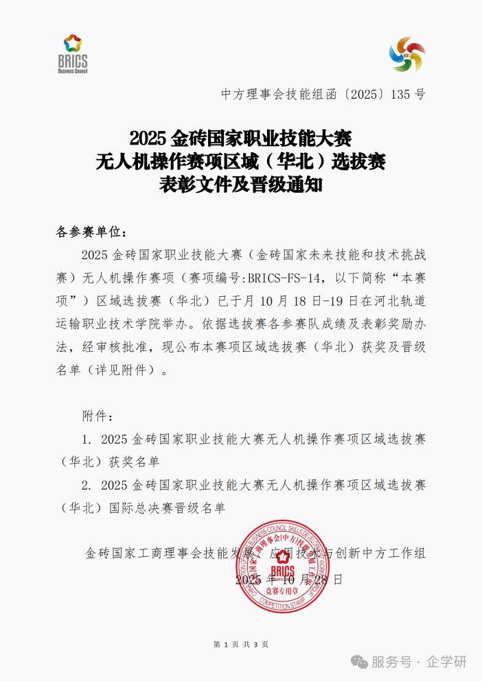 上一篇:2025一帶一路暨金磚大賽之首屆工業(yè)互聯(lián)網(wǎng)智能部署與數(shù)字運(yùn)維賽項(xiàng)決賽的報(bào)到通知 下一篇:2025金磚國家職業(yè)技能大賽無人機(jī)操作賽項(xiàng)區(qū)域選拔賽(東北)表彰文件及晉級(jí)通知