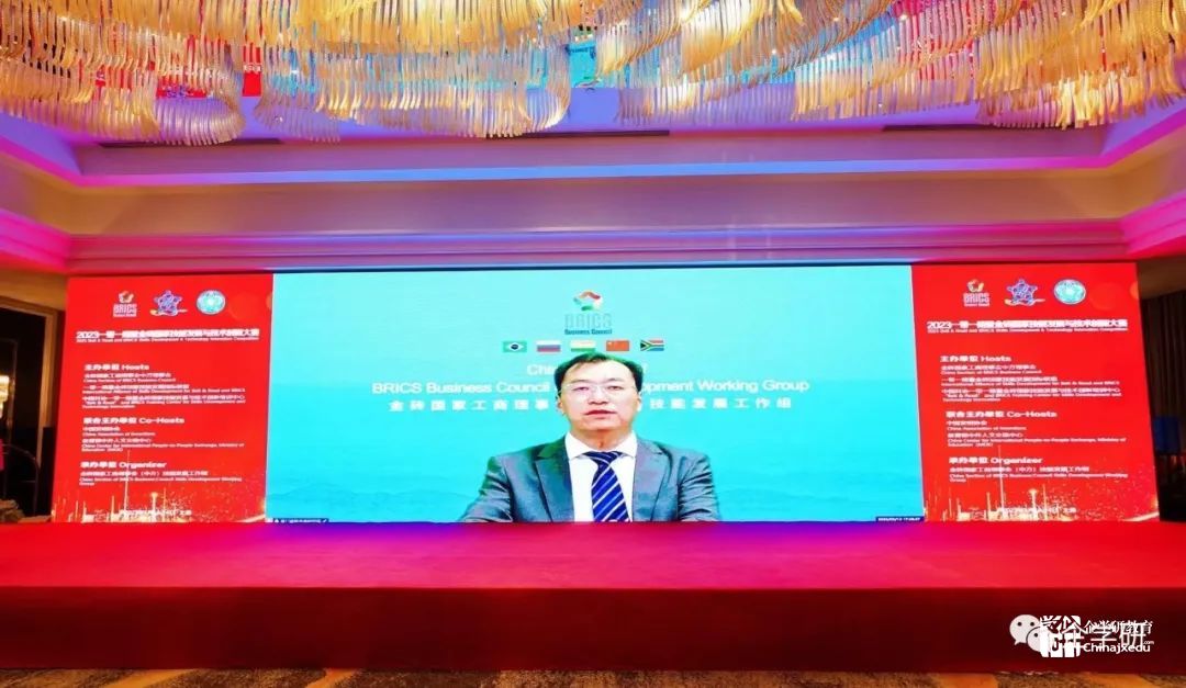 金磚國(guó)家工商理事會(huì)中方技能組主席、一帶一路暨金磚國(guó)家技能發(fā)展國(guó)際聯(lián)盟理事長(zhǎng)、金磚國(guó)家技能發(fā)展與技術(shù)創(chuàng)新大賽組委會(huì)執(zhí)委會(huì)主席 劉振英 博士(劉博士以視頻致辭方式參加);