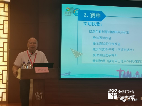 本次培訓(xùn)特別邀請(qǐng)第44屆世界技能大賽移動(dòng)機(jī)器人項(xiàng)目國(guó)家隊(duì)教練組組長(zhǎng)、45屆世賽移動(dòng)機(jī)器人項(xiàng)目國(guó)家隊(duì)技術(shù)指導(dǎo)專家、北京市工貿(mào)技師學(xué)院電氣系主任閆毅平,2019喀山未來(lái)技能大賽金牌教練、韶關(guān)市技師學(xué)院劉志宏,2023一帶一路暨金磚無(wú)人機(jī)賽項(xiàng)專家組長(zhǎng)、2022、2023金磚國(guó)家職業(yè)技能大賽無(wú)人機(jī)賽項(xiàng)首席專家武漢城市職業(yè)學(xué)院機(jī)電學(xué)院副院長(zhǎng)何錫武做報(bào)告,以世界技能大賽、喀山未來(lái)技能大賽、金磚國(guó)家職業(yè)技能大賽實(shí)際賽項(xiàng)為例分享“裁教一體”執(zhí)裁經(jīng)驗(yàn)。